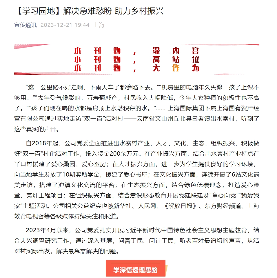 自2018年起,公司党委全面推进出水寨村产业、人才、文化、生态、组织振兴,积极做好“双一百”村企结对工作,投入资金200余万元。在产业振兴方面,结合出水寨村产业特点在丫口村援建了爱心桑园、爱心蚕房;在人才振兴方面,进一步为学生提供良好的学习环境,向当地学生发放了10期奖助学金,援建了爱心书屋;在文化振兴方面,连续开展了6站文化遗美走访,搭建了沪滇文化交流的平台;在生态振兴方面,结合绿色低碳理念,打造爱心澡堂、亮灯工程项目;在组织振兴方面,结合意识形态教育开展党建联建及“童心向党”“我爱我家”主题活动。公司相关公益纪实也被新华社、人民网、《解放日报》、东方财经频道、上海教育电视台等各级媒体持续关注和报道。