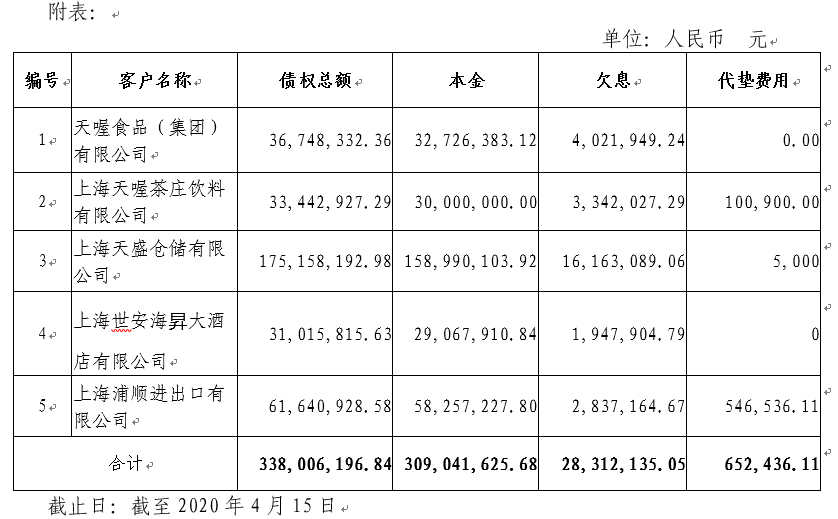 上海凯发·k8国际(中国)首页登录 经营有限公司拟对从工商银行上海市分行受让的天喔食品(集团)有限公司等5户债权进行处置。详见附表。(债权信息供参考,最终以借据、合同、法院判决等有关法律资料为准。)